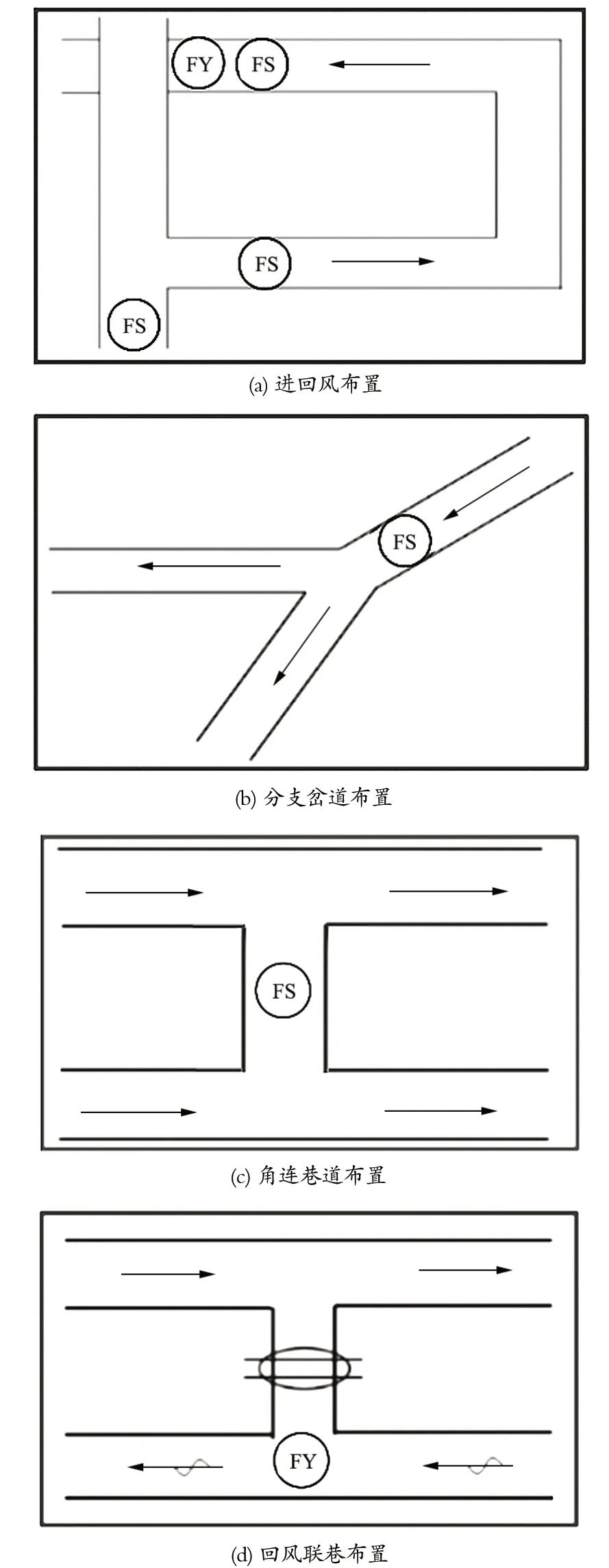 針對井下各地點作業內容與通風不同方式,尤其是在繞道車場、分支岔路巷道和聯絡巷等地點,需要安裝傳感器進行監測。此外,在 Y 形和 U 形通風方式的采煤工作面回風流側也容易出現風流不穩定現象;在主要運輸大巷、掘進工作面設置有調節風窗的風門前后,由于運輸需要經常開啟風門,容易導致風流擾動影響較大,產生局部風速、風壓變化。這些地點均需要安裝傳感器加強監測。