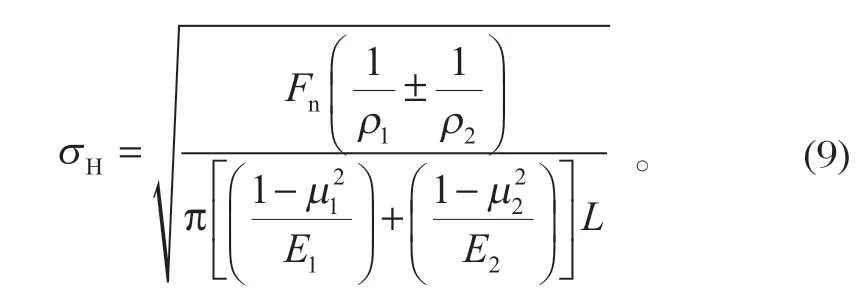 3.2 理論計算Hertz 接觸理論是研究疲勞、摩擦及任何有接觸體相互作用的基本理論。在齒輪嚙合過程中,將齒輪的接觸問題等效為兩圓柱面的接觸問題。赫茲接觸應力